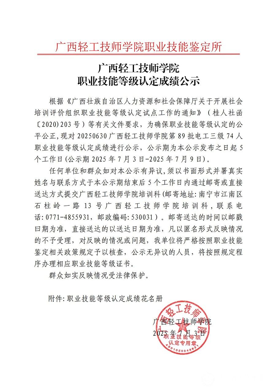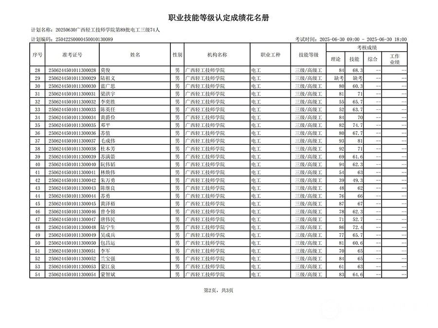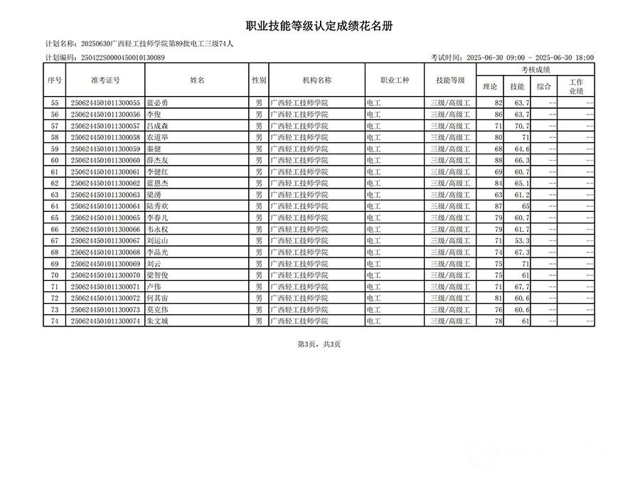 20250630广西轻工技师学院第89批电工三级74人职业技能等级认定成绩公示