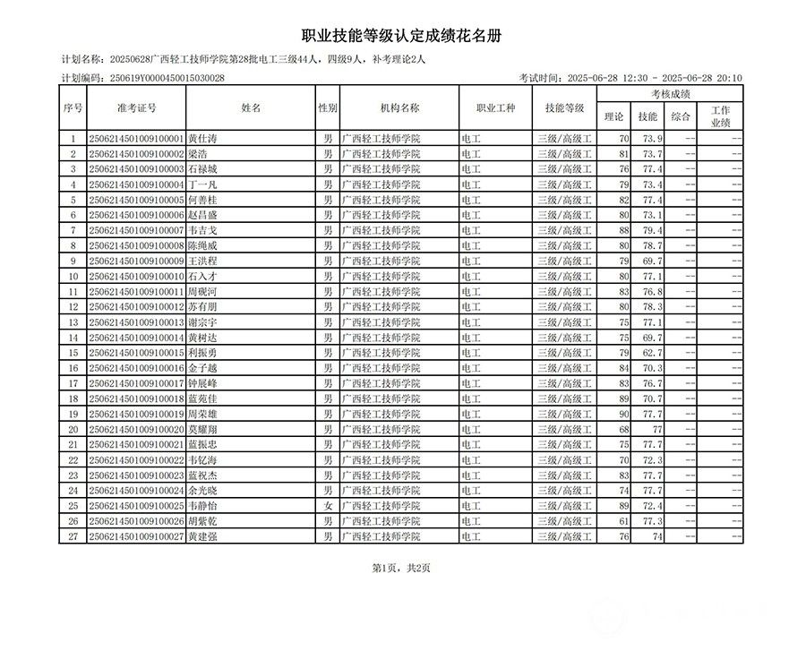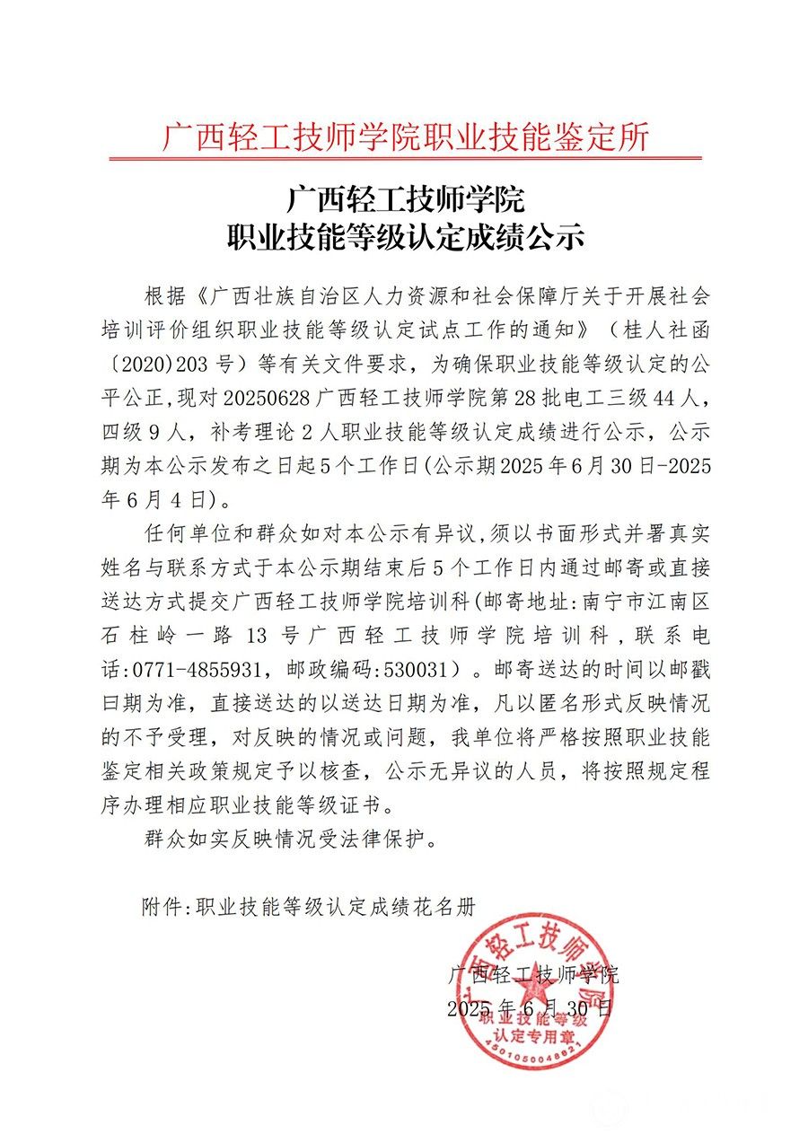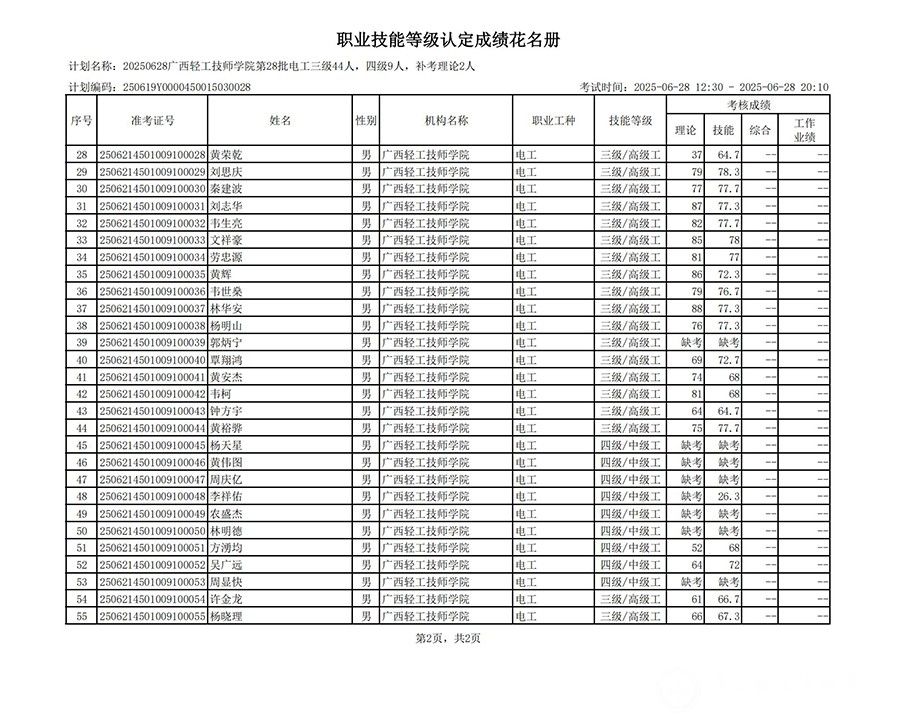 20250628广西轻工技师学院第28批电工三级44人,四级9人,补考理论2人职业技能等级认定成绩公示