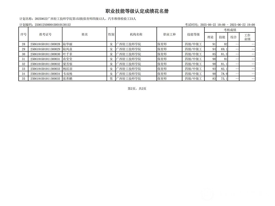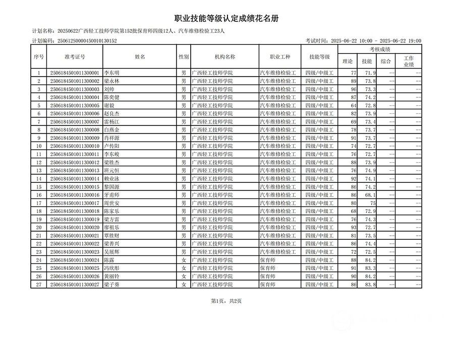 20250622广西轻工技师学院第152批保育师四级12人、汽车维修检验工23人职业技能等级认定成绩公示