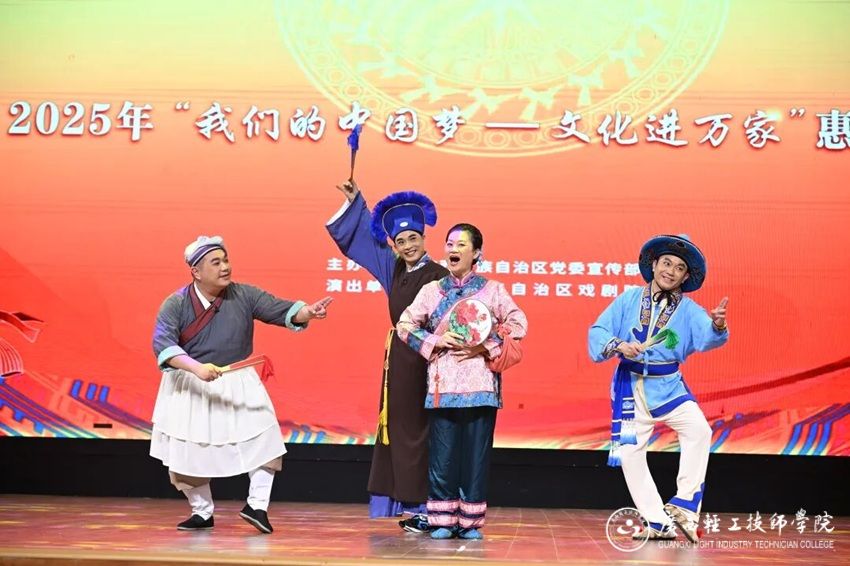 (广西轻工技师学院网 团委讯 撰稿:郑月颖 摄影:覃诗雨、梁镁婧)2025年10月16日晚,由广西壮族自治区党委宣传部主办、广西壮族自治区戏剧院演出的2025年“我们的中国梦——文化进万家”惠民演出暨送文艺精品下基层活动在我院石柱岭校区大礼堂隆重举行,为我院师生带来了一场精彩纷呈的文化盛宴,现场气氛热烈,掌声不断。