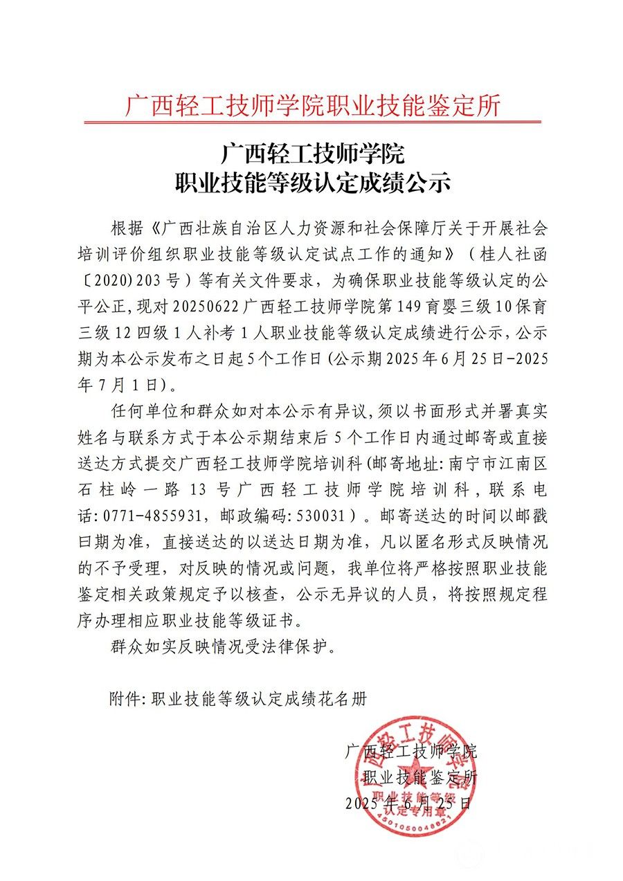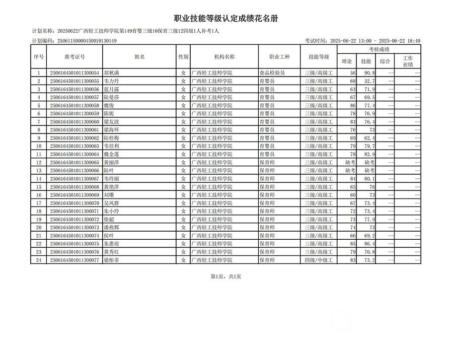 20250622广西轻工技师学院第149育婴三级10保育三级12 四级1人补考1人职业技能等级认定成绩公示